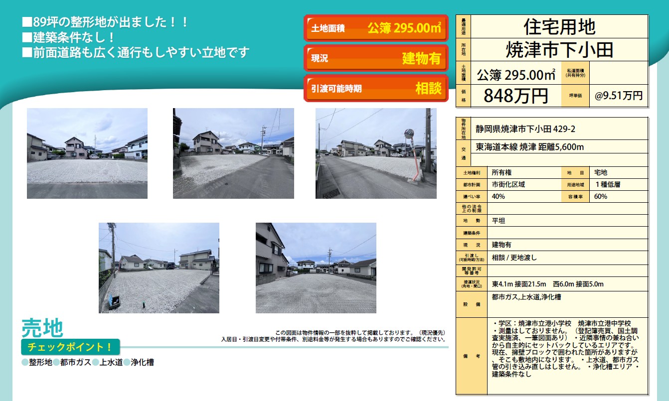 | 備考 | ・測量はしておりません(登記簿売買、国土調査実施済み、一筆図面有) ・近隣事情の兼ね合いから自主的にセットバックしているエリアです 現在、擁壁ブロックで囲われた箇所がありますがそこも敷地内となります ・上水道、都市ガス管の引き込み直しはしません ・浄化槽エリア |