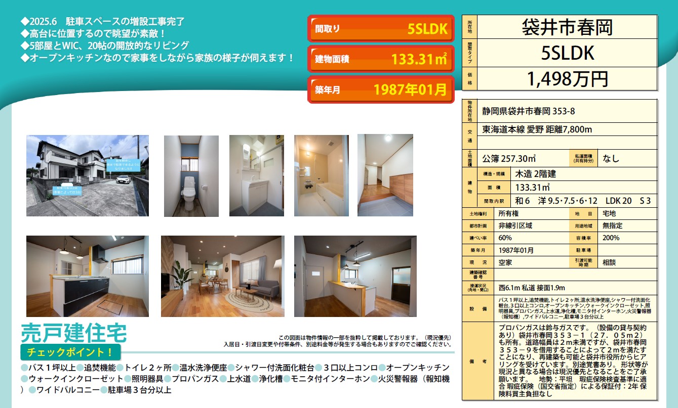 | 備考 | 袋井市春岡353-1(27.05㎡)も所有。道路幅員は2m未満ですが 袋井市春岡353-9を借用することによって2mを満たすこととなり 再建築も可能と袋井市役所からヒアリングを受けています。 (別途覚書あり) 形状等が現況と異なる場合は現況優先となることをご渉猟願います。 瑕疵保険検査基準に適合 瑕疵保険(国交省指定)による保証付:2年 保険料買主負担なし 設備 一坪風呂、追焚機能、トイレ2か所、温水洗浄便座、シャワー付洗面化粧台、3口以上コンロ、オープンキッチン、ウォークインクローゼット、照明器具、プロパンガス、上水道、浄化槽、 モニタ付インターホン、火災警報器(報知器)ワイドバルコニー、 駐車場3台分以上 |