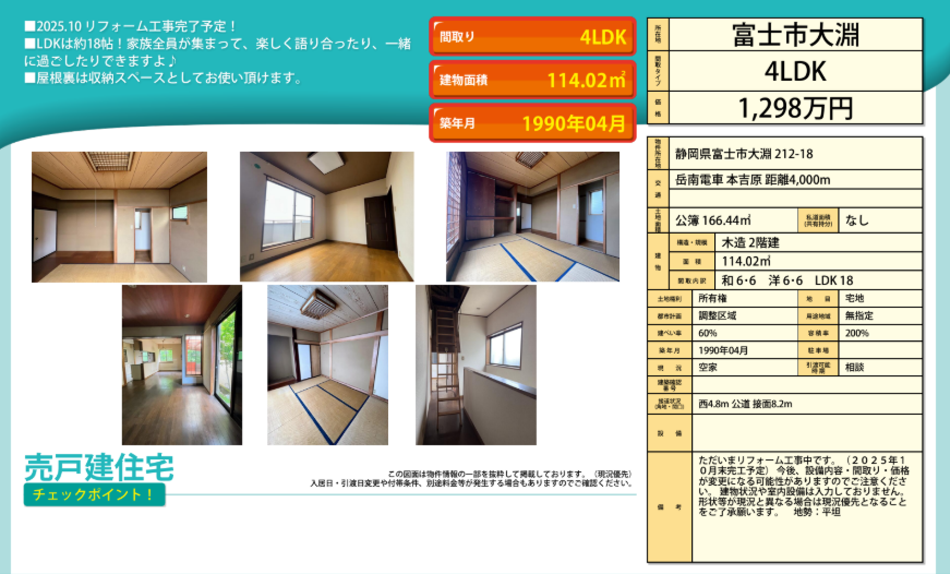 備考 | ただいまリフォーム工事中です(2025年10月完工) 今後設備内容や間取り、価格が変更になる可能性がありますのでご注意ください。 形状等が現況と異なる場合は現況優先となることをご了承ください。 |