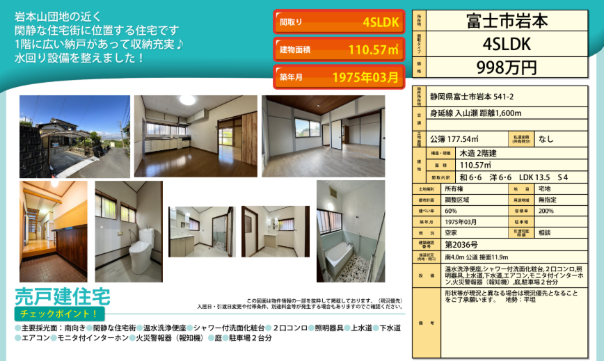 備考 | 形状等が現況と異なる場合は現況優先となることをご了承願います。 設備 温水洗浄便座、シャワー付洗面化粧台、2口コント、照明器具、上水道、下水道、エアコン、モニタ付インターホン、火災警報器(報知器)、庭、駐車場2台分 |