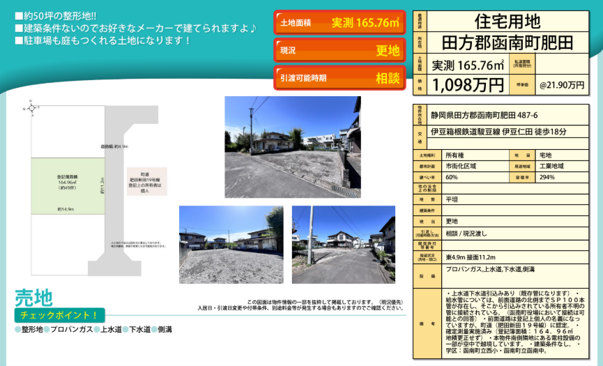 備考 | ・上水道下水道引き込み有 ・給水管については、前面道路の北側までSP100本間が存在し、そこから引込みされている所有者不明の管に接続されている。 (函南町役場において接続は可能との回答) ・前面道路は登記上個人の名義になっていますが、 町道(肥田新田19号線)に認定。 ・確定測量実施済み(登記簿面積:164.96㎡ 地積更生せず) ・本物件南側隣地にある電柱設備の一部が空中で越境しています。 |