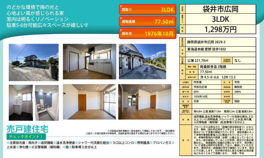 備考 | 隣地(袋井市広岡字下ノ坪2829番1)からの雨水について覚書が手結されています。 確定測量によって本物物件東側駐車場入口に敷設されているコンクリートが、本物件敷地内の速攻(水路)に橋となっていること、 また一部が越境していることが判明。現況での是正措置はなし。 再構築時に協議が必要となります。 排水管について道路占用許可を取得しており、継承していただきます。敷地内を一部電線が空中で越境しています。現況にて引き渡しします。形状等が現況と異なる場合は現況優先となることをご了承願います。 設備 追焚機能、温水洗浄便座、シャワー付洗面化粧台、3口以上コンロ、 照明器具、プロパンガス、上水道、浄化槽、火災警報器(報知器)、 庭、駐車場3台分以上 |