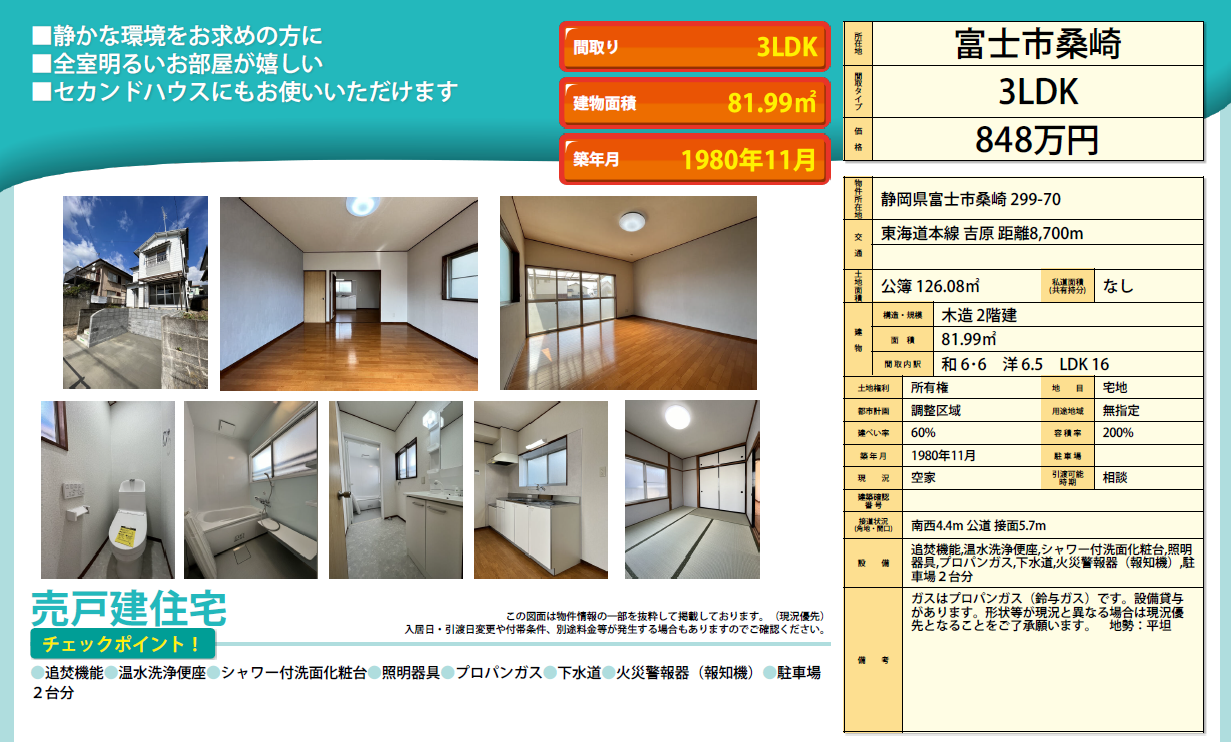 | 備考 | ガスはプロパンガスです。設備貸与があります。 形状等が現況と異なる場合は現況優先になることをご了承願います。 |